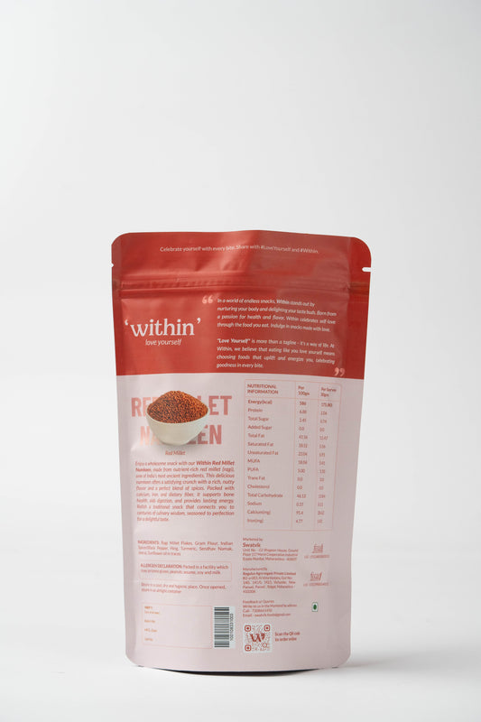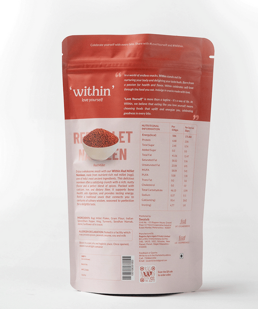 Within Red Millet Namkeen, where tradition meets modern health consciousness. Crafted from the ancient grain ragi, also known as red millet, our snack is a testament to the wisdom of our ancestors combined with contemporary nutritional science. This delicious namkeen combines the rich, nutty flavour of red millet with a perfect blend of Indian spices for a satisfying crunch. It’s an excellent source of calcium, iron, and dietary fibre, supporting bone health, enhancing digestion, and providing sustained energy.