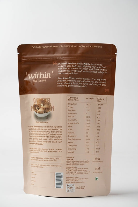 Within Oyster Mushroom Chips, a baked delight crafted from nutrient-packed oyster mushroom powder and enhanced with crunchy flax seeds and zesty peri peri spices. This innovative snack is baked to perfection, preserving all the natural goodness without the use of harmful oils or preservatives. Oyster mushrooms rich in essential vitamins, minerals, and antioxidants, they support immune function, boost energy levels, and promote heart health. Their natural umami flavor adds depth to every bite.